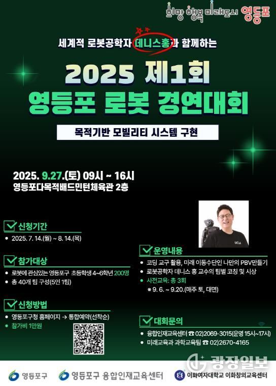 또 9월 27일에는 세계적 로봇공학자 ‘데니스 홍’과 함께하는 ‘제1회 영등포 롯봇경연대회’가 개최된다. 관내 초등학교 4~6학년 200명이 사회문제 해결을 주제로 직접 로봇을 제작하고, 데니스 홍 교수가 현장에서 코칭을 진행한다. 구는 이번 대회를 영등포 대표 과학경연으로 발전시켜 차세대 혁신 인재를 발굴해나갈 계획이다.
