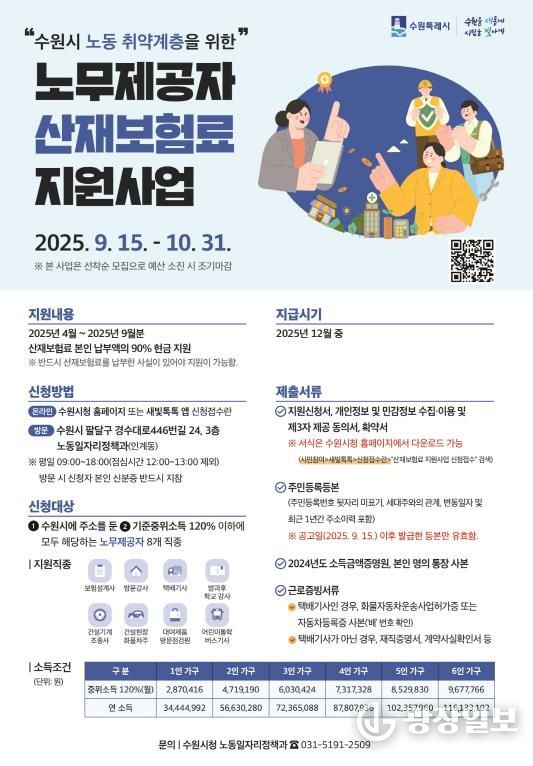 광장일보 나학천 기자 | 수원시는 10월 31일까지 ‘2025년 하반기 노동 취약계층 노무제공자 산재보험료 지원사업’ 신청을 받는다.