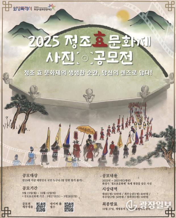 광장일보 나병석 기자 | 화성시문화관광재단은 화성시 대표 축제인 ‘정조 효 문화제’에 대한 관심도 확산과 축제 현장의 감동과 재미를 생생히 알리고자 '2025 정조효문화제 사진공모전'을 개최한다.