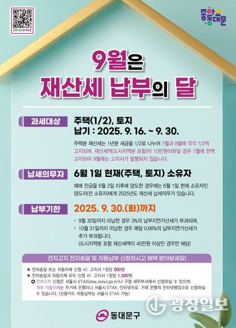광장일보 주리아 기자 | 서울 동대문구는 9월 정기분 재산세를 납세의무자에게 부과‧고지했다고 16일 밝혔다.