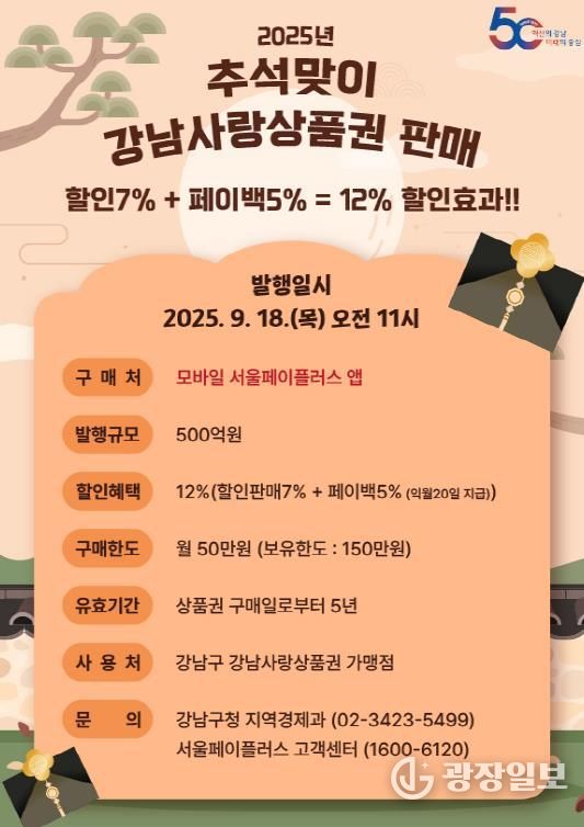 광장일보 주리아 기자 | 꿈이 모이는 도시, 미래를 그리는 강남구가 9월 18일 오전 11시 서울시 최대 규모인 500억 원의 ‘강남사랑상품권’을 발행해 추석 민생경제 지원에 나선다.