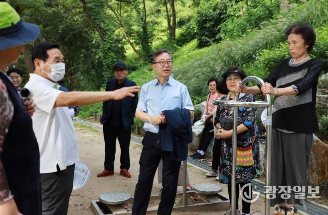 반가워하던 주민들은 곧이어 유 구청장에게 어려움을 꺼내놓았다. 이 근방에 산다는 황충관(80) 씨는 “이곳에서 매일 30~40명이 정기적으로 운동을 한다”며 “다만 지붕이 없어 비가 올 때는 어쩔 수 없이 운동을 쉬어간다”고 아쉬움을 토로했다. 시흥2동 주민인 이연옥(67) 씨 역시 “안전하게 운동을 하고 싶다”며 “일부 빗물에 흙이 떠내려가 바닥이 패인 곳도 있다”고 설명했다.