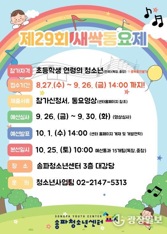 광장일보 주리아 기자 | 서울 송파구가 가을날 청소년들의 감수성을 채워줄 아동·청소년 음악축제를 10월 25일 송파청소년센터 대강당에서 개최하고, 참가팀을 모집한다고 알렸다.
