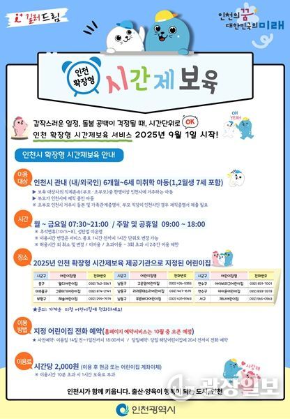 한편, 이번 ‘아이플러스(i+) 길러드림’ 확장형 시간제 보육은 인천시가 추진하는 저출생 극복을 위한 ‘아이플러스(i+) 출생정책 6종(이어드림, 맺어드림, 1억드림, 집드림, 차비드림, 길러드림) 시리즈’중 하나로, 생애주기별 맞춤형 지원을 통해 아이 낳고 키우기 좋은 도시 조성에 기여할 것으로 기대된다.