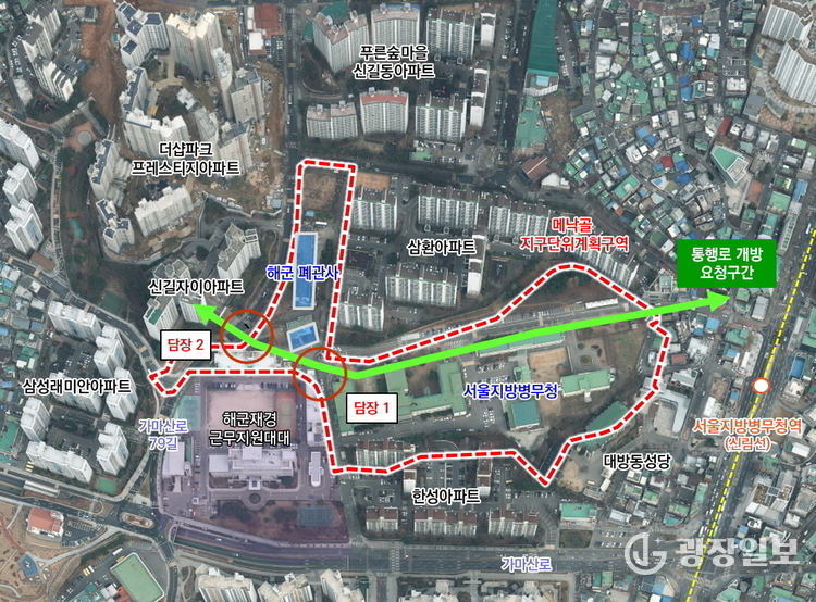 현재 신림선 병무청역 개통으로 병무청 부지가 일부 개방됐지만, 해군 폐관사 부지는 여전히 통행이 제한돼 주민 불편이 이어지고 있다.