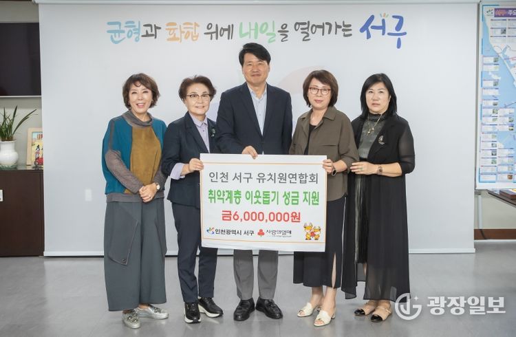 광장일보 주재영 기자 | 인천 서구는 16일, 인천서구유치원연합회(회장 신혜숙)가 이웃돕기 성금 600만 원을 기부했다고 17일 밝혔다. 이날 전달된 성금은 관내 저소득 주민을 위한 복지에 쓰일 예정이다.