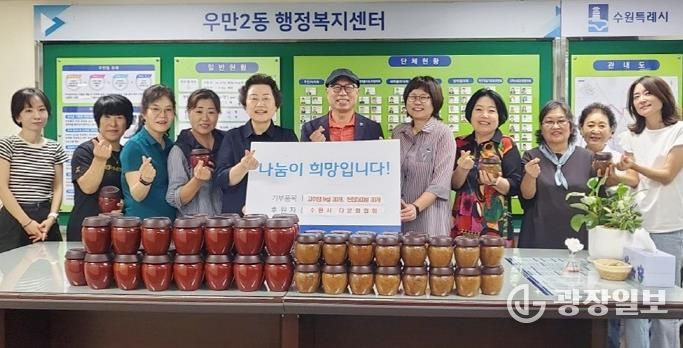 광장일보 나학천 기자 | 지난 9월 16일, 수원시 다문화협회는 우만2동 행정복지센터에서 ‘전통장류 이웃돕기 전달식’을 진행하며, 고추장 30개(1kg)와 된장 30개(500g)를 수원시 팔달구 우만2동에 전달했다.