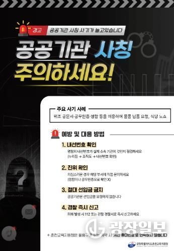춘천교육지원청 관계자는 “최근 교육청 직원을 사칭한 사기 시도가 급증하고 있다.”며, “교육청은 개인 휴대전화 번호로 거래를 요청하지 않는다. 만약 개인 휴대전화 번호로 주문이나 예약을 받았다면 즉시 거래를 중단하고, 반드시 교육청 공식 연락처를 통해 사실 여부를 확인해달라”고 강조했다.