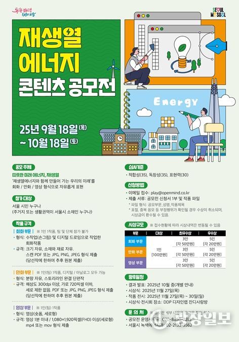 광장일보 주리아 기자 | 서울시는 신재생에너지원 중 다소 생소한 에너지원인 재생열에 대한 시민 이해도를 높이고, 활용방안에 대한 인식을 제고하기 위해 '재생열 에너지 콘텐츠 공모전'을 개최한다. 18일 접수를 시작하는 공모전은 회화, 만화, 영상(숏폼형태) 3개 부문이 있으며, 서울시민 누구나 신청 가능하다.