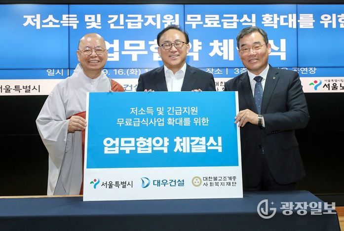 서울시는 ㈜대우건설, 대한불교조계종복지재단과의 업무협약을 통해 ‘저소득어르신 급식지원사업’ 대상자를 약 150명 늘리기로 했다.