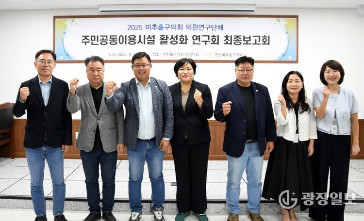 광장일보 주재영 기자 | 인천광역시 미추홀구의회 의원연구단체 '주민공동이용시설 활성화 연구회'(대표의원 이선용, 연구의원 이관호·정락재)는 2025년 9월 16일 미추홀구의회 세미나실에서 연구용역 최종보고회를 개최했다.