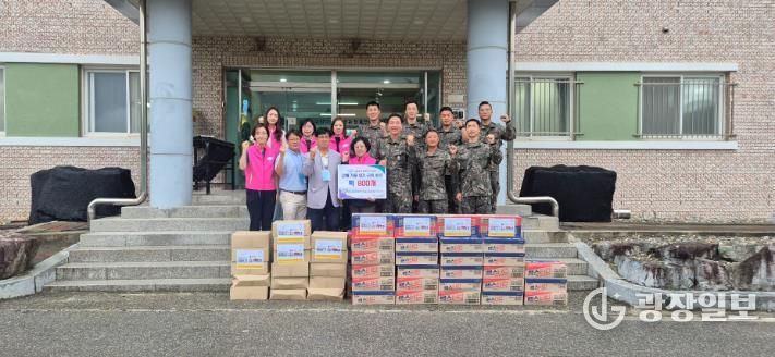 광장일보 이현나 기자 | (사)고향사랑주부모임 강원특별자치도회는 강릉시자원봉사센터와 연계하여 17일 강릉 가뭄 극복을 위해 현장에 지원나온 군 장병을 위한 떡 800세트를 23경비여단 1대대를 찾아 전달했다.