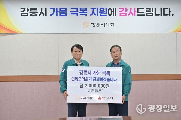 광장일보 이현나 기자 | 인제군의회는 이춘만 의장을 비롯한 의원들이 17일 강릉시의회를 방문, 강릉시 가뭄 피해 성금 200만원을 기탁하고 가뭄 위기 극복을 기원했다.