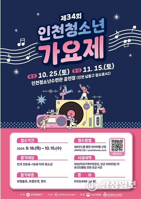 광장일보 주재영 기자 | 인천시설공단은 청소년들의 음악적 열정과 끼를 발산하고 건전한 청소년 문화를 조성하고자 '제34회 인천청소년 가요제'의 참가자 모집을 내달 15일까지 진행한다.
