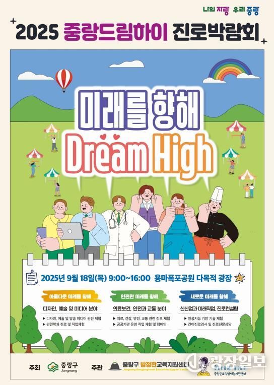 광장일보 주리아 기자 | 중랑구는 9월 18일 오전 9시부터 오후 4시까지 용마폭포공원 다목적광장에서 ‘2025 중랑드림하이 진로박람회’를 개최한다. 이번 행사는 중랑구가 주최하고 중랑구 방정환교육지원센터와 중랑진로직업체험지원센터가 공동 주관하며, 관내 중학생 2,000여 명과 학부모, 교원, 지역사회 관계자들이 참여한다.