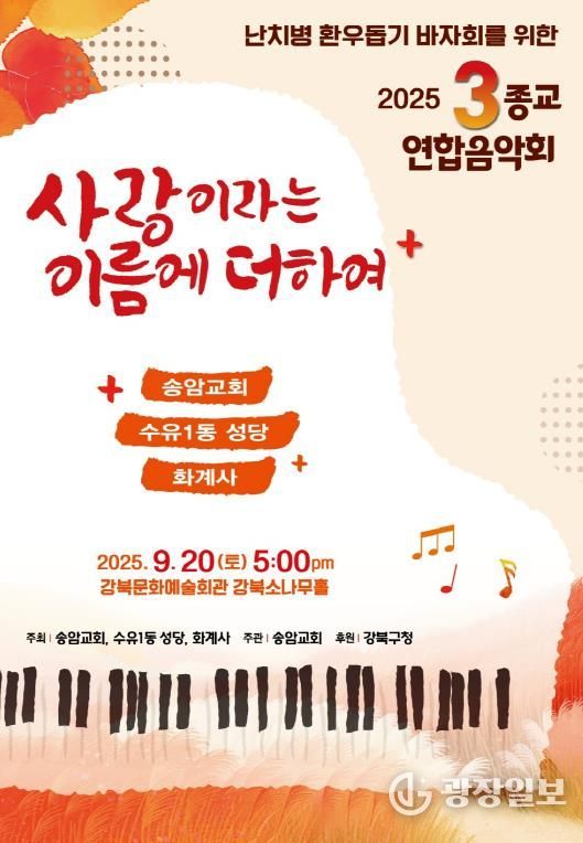 주관을 맡은 송암교회 김정곤 담임목사는 “25년간 한결같은 마음으로 함께해주신 화계사와 수유1동 성당 덕분에 새로운 첫걸음을 내딛을 수 있었다”며 “이번 3종교 연합 음악회가 종교를 넘어 모두에게 따뜻한 온정을 일깨우고, 지역 주민들이 함께 음악을 즐길 수 있는 시간이 되길 바란다. 난치병 환우들에게 희망을 전하는 이번 행사에 많은 관심과 참여를 부탁드린다”고 전했다.