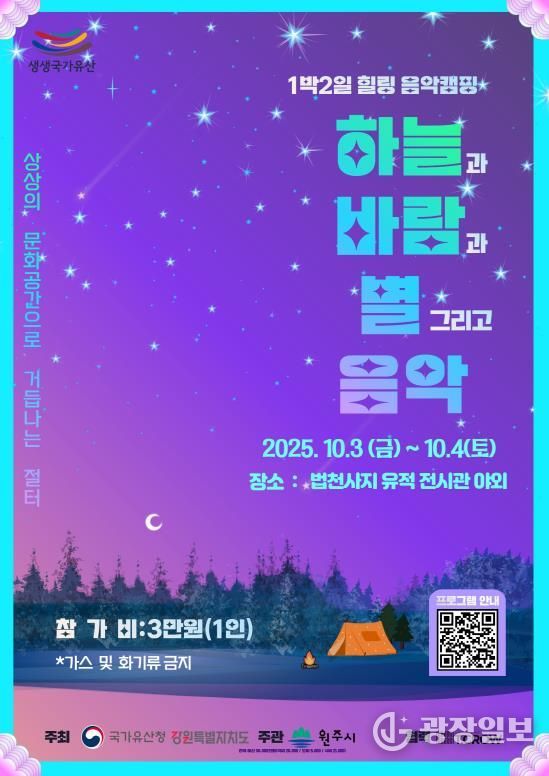 광장일보 이현나 기자 | 원주시역사박물관은 다음 달 3일과 4일, 부론면 법천사지에서 힐링 음악캠프 ‘법천사지 하늘과 바람과 별 그리고 음악’을 진행한다.