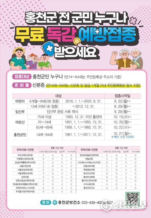광장일보 이현나 기자 | 홍천군보건소가 오는 9월 22일부터 2025-2026절기 인플루엔자 예방접종을 시작한다고 밝혔다.