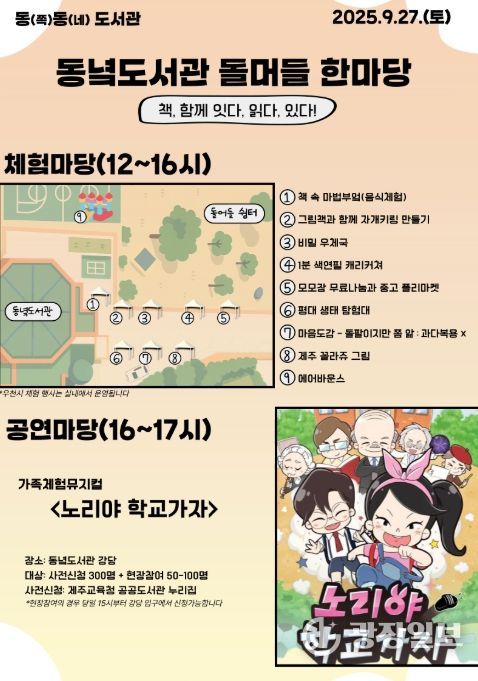 광장일보 주재영 기자 | 제주도교육청 동녘도서관은 조천읍도서관과 함께 오는 27일 낮 12시부터 오후 5시까지 동녘도서관에서 지역 주민을 대상으로 ‘돌머들 한마당’ 행사를 개최한다.