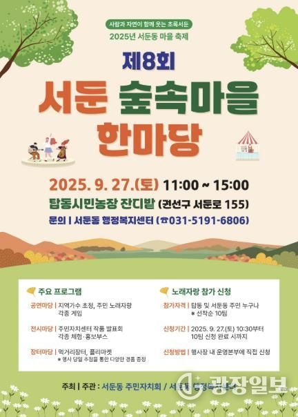 광장일보 나학천 기자 | 수원시 권선구 서둔동 주민자치회와 행정복지센터는 오는 9월 27일, 탑동시민농장 잔디밭에서 서둔동 마을 축제 '제8회 서둔 숲속마을 한마당'을 개최한다.