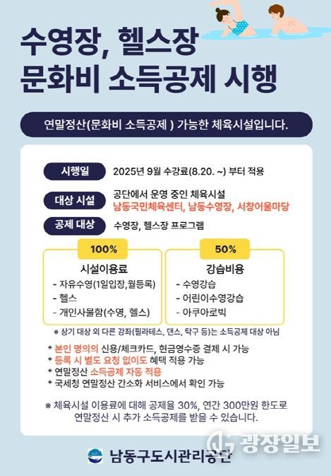 광장일보 주재영 기자 | 인천시 남동구 도시관리공단은 공공 체육시설 수영장 및 헬스장 이용료에 대한 문화비 소득공제 혜택을 제공한다고 18일 밝혔다.