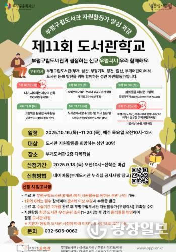 광장일보 주재영 기자 | 부평구 구립 부개도서관은 18일부터 2025년 부평구립도서관 자원활동가 양성 과정 ‘제11회 도서관학교’ 참가자를 모집한다.