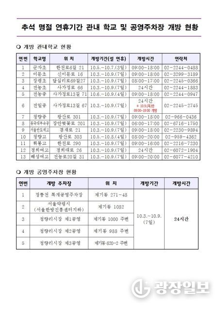 광장일보 주리아 기자 | 서울 동대문구는 추석 연휴를 맞아 주민과 방문객, 역귀성객 등의 주차 편의를 돕기 위해 10월 3일부터 9일까지 7일간 관내 학교 및 공영주차장 18개소를 무료로 개방한다고 밝혔다.