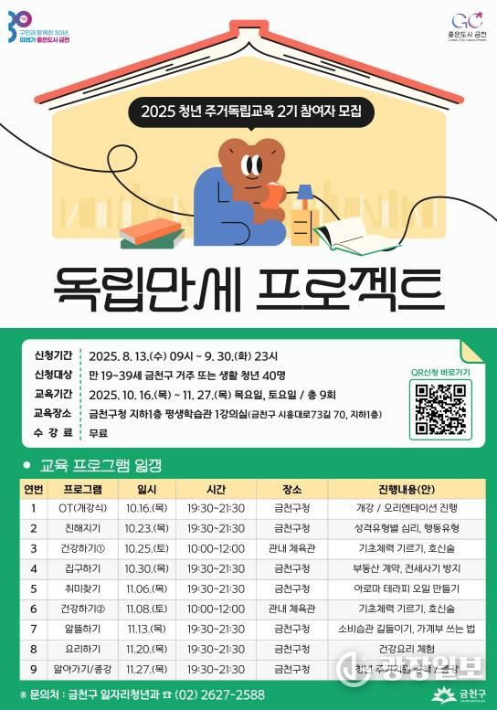 유성훈 금천구청장은 “청년들이 주거 독립을 과정에서 겪는 전세사기 등의 다양한 위험을 예방하고, 안정적인 생활을 위한 기초 역량을 기를 수 있도록 돕는 데 중점을 두었다”며 “많은 청년들의 관심과 참여를 바란다”고 전했다.