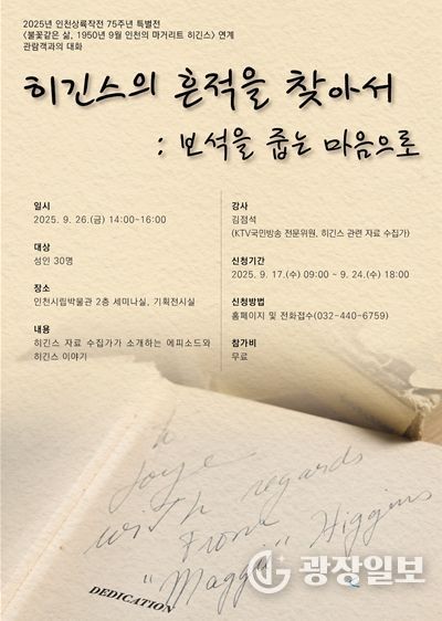 광장일보 주재영 기자 | 인천광역시 시립박물관은 9월 26일‘불꽃같은 삶: 1950년 9월 인천의 마거리트 히긴스’ 특별전과 연계해 ‘관람객과의 대화’ 행사를 개최한다고 밝혔다.