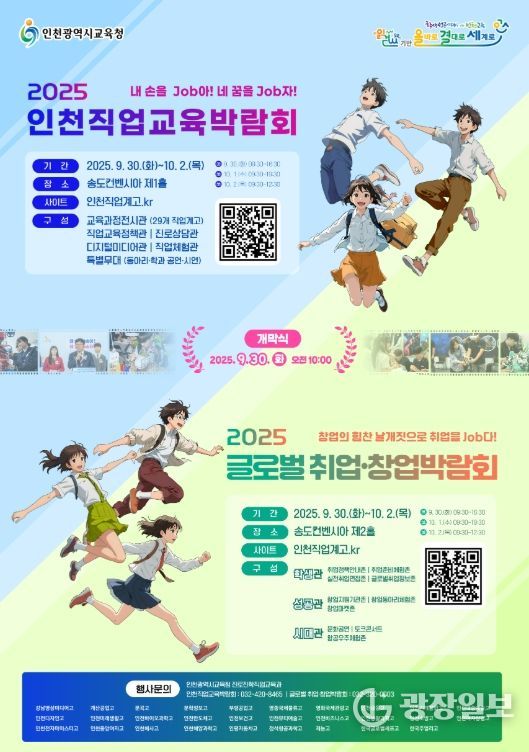 광장일보 주재영 기자 | 인천광역시교육청은 9월 30일부터 10월 2일까지 3일간 송도컨벤시아에서 ‘2025 인천직업교육박람회’와 ‘2025 글로벌 취업·창업박람회’를 동시 개최한다고 19일 밝혔다.