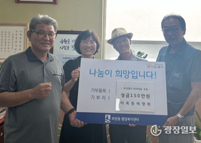 광장일보 나학천 기자 | 수원시 장안구 파장동은 지난 18일, 이목동 애향회에서 추석을 맞이하여 홀로 계신 어르신과 저소득 취약계층 등 소외된 이웃들에게 힘이 되고자 성금 150만원을 기부했다고 밝혔다.