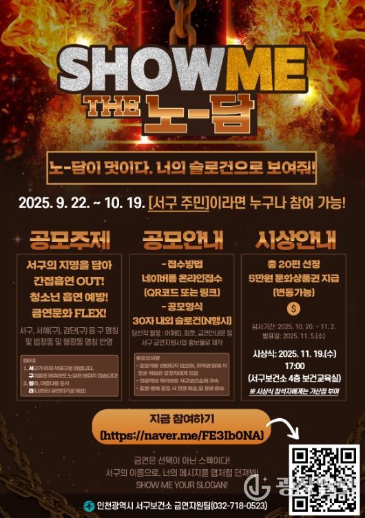 광장일보 주재영 기자 | 인천 서구는 지역 사회 내 금연환경을 만드는 데 앞장서고자, ‘인천 서구 금연 슬로건 공모전’을 개최한다고 19일 밝혔다.