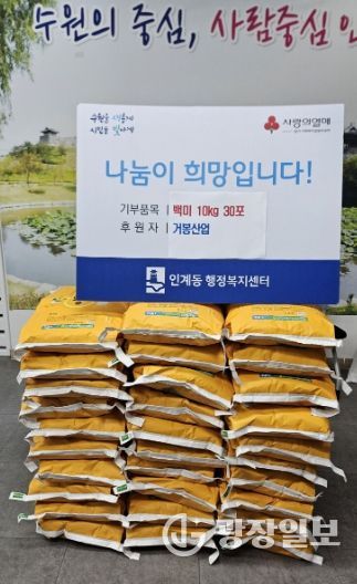 광장일보 나학천 기자 | 거봉산업에서 지난 9월 18일 수원시 팔달구 인계동행정복지센터에 취약계층을 위한 백미 10kg 30포를 전달했다.