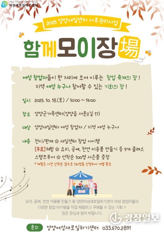 광장일보 이현나 기자 | 양양여성새로일하기센터(이하 양양새일센터)는 오는 10월 18일 오전 10시부터 오후 2시까지 양양군가족센터 일원에서 여성 창업 축제 '함께 모이場'을 개최한다.