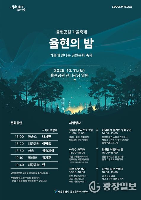 광장일보 주리아 기자 | 서울시는 강남구 세곡동에 위치한 율현공원에서 마술부터 가요까지 다양한 공연과 정원체험 프로그램을 만날 수 있는 가을 축제 ‘율현의 밤’을 10월 11일 선보인다.