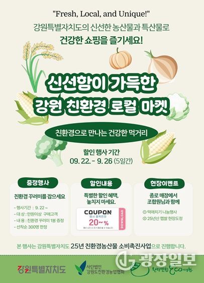 광장일보 이현나 기자 | 강원특별자치도는 9월 22일부터 26일까지 5일간 두레생협 전국 111개 매장에서 '강원특별자치도 친환경 로컬마켓 2탄'을 동시에 개최한다고 밝혔다.