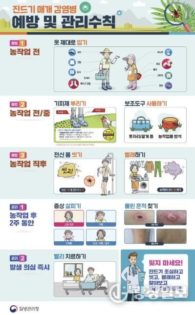 진드기에 의해 발생하는 대표적인 감염병으로는 쯔쯔가무시증과 중증열성혈소판감소증후군(SFTS) 등이 있으며, 환자의 70% 이상이 가을철에 집중적으로 발생한다. 특히 풀숲 등 진드기가 서식하기 쉬운 환경에서 야외활동이 많아지는 만큼 예방수칙 준수가 무엇보다 중요하다.