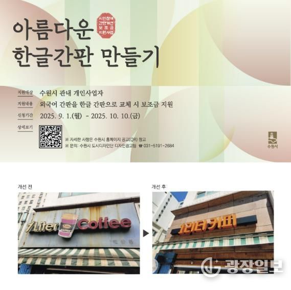 광장일보 나학천 기자 | 수원시는 10월 10일까지 ‘시민참여 간판개선 보조금 지원사업(아름다운 한글 간판 만들기)’에 참여할 사업자를 추가 모집한다.