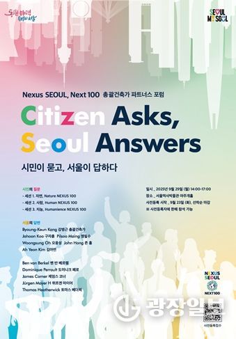 광장일보 주리아 기자 | 서울시는 오는 9월 29일 오후 2시, 서울역사박물관 야주개홀에서 『Nexus 서울 Next100: 제2차 총괄건축가 파트너스 포럼』을 개최한다. 이번 포럼은 지난 3월 21일 열린 제1차 포럼의 연속 기획으로, 제시된 미래도시 비전에 대해 이번에는 시민이 질문하고 전문가가 답하는 공론의 장이다.