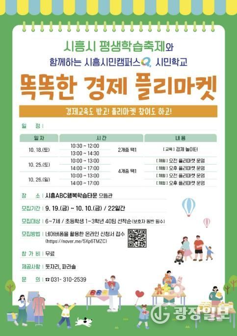 광장일보 이현나 기자 | 시흥시는 제17회 시흥시평생학습축제(10월 24일~26일)와 연계해 어린이들의 경제활동 이해 증진과 가족 간 소통 강화를 위한 ‘똑똑한 경제 플리마켓’을 오는 10월 18일부터 시흥ABC행복학습타운 으뜸관에서 추진한다.