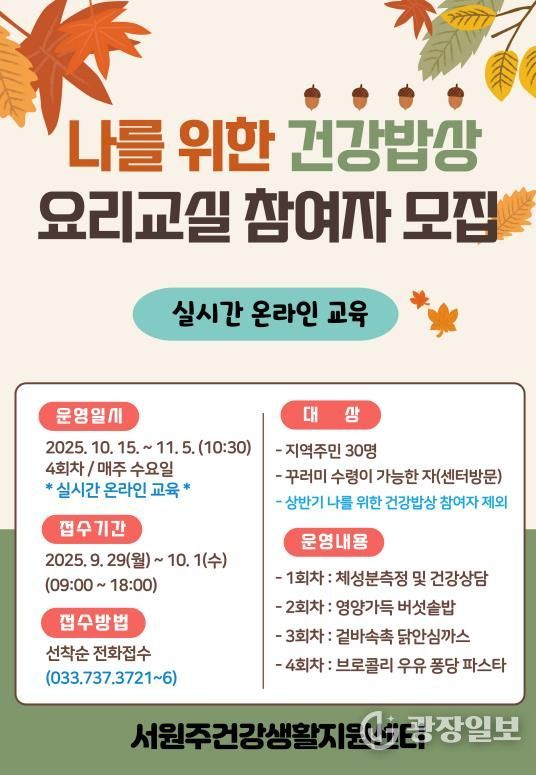 광장일보 이현나 기자 | 서원주건강생활지원센터는 지역 주민의 올바른 식습관 형성과 대사증후군 예방·관리를 돕기 위해 ‘나를 위한 건강밥상 요리교실’ 프로그램 참여자를 모집한다.