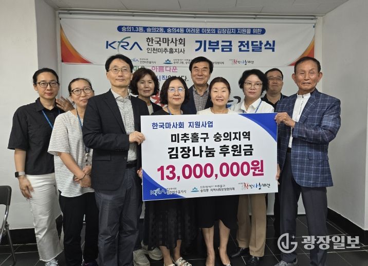 광장일보 주재영 기자 | 한국마사회 인천미추홀지사(지사장 조영진)는 미추홀구 숭의1·3동, 숭의2동, 숭의4동 일대 취약계층을 지원하기 위해 김장 나눔 후원금 1,300만 원을 학산나눔재단에 전달했다고 23일 밝혔다.