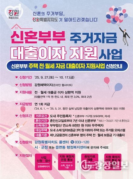 광장일보 이현나 기자 | 강원특별자치도는 9월 27일부터 10월 17일까지 '신혼부부 주거자금 대출이자 지원사업' 대상자를 3차 모집한다고 밝혔다.