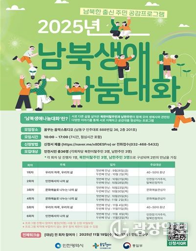광장일보 주재영 기자 | 인천광역시는 북한이탈주민과 인천 주민이 서로의 삶을 이야기하며 공감대를 형성하는 시민참여형 프로그램인 ‘남북생애나눔대화’ 를 9월 26일부터 11월 19일까지 진행한다고 밝혔다.