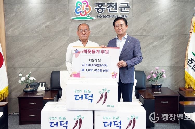 광장일보 이현나 기자 | 이원태 님은 9월 23일 홍천군청을 방문하여 추석을 맞아 어려운 이웃들이 따뜻한 명절을 보낼 수 있도록 성금 50만 원과 더덕(생) 3박스(50만원 상당) 등 총 100만원 상당의 성금과 성품 기탁했다.