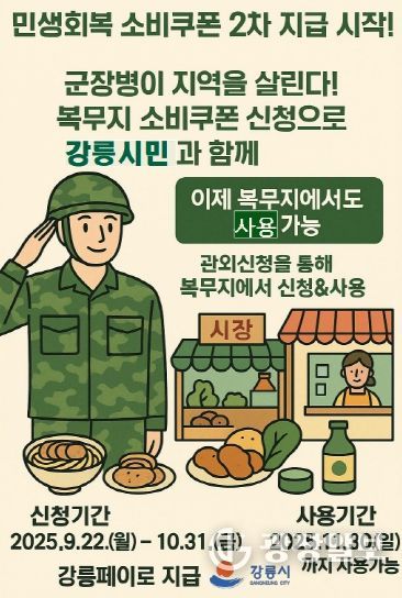 광장일보 이현나 기자 | 강릉시는 민생회복 소비쿠폰 2차 개선 사항인 군 장병 복무지 신청을 위하여, 9월 24일부터 관내 부대를 대상으로 '민생회복 소비쿠폰 군 장병 대상 찾아가는 신청 서비스'를 운영한다.