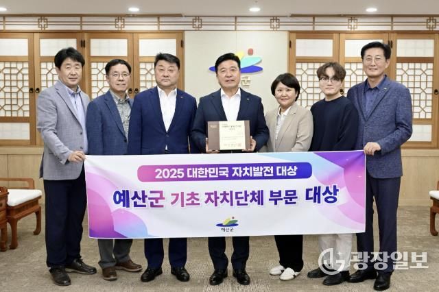 광장일보 주재영 기자 | 예산군은 지난 23일 한국자치발전연구원이 주최한 ‘2025년 대한민국 자치발전 대상’ 시상식에서 기초자치단체 부문 대상 수상을 수상했다고 밝혔다.