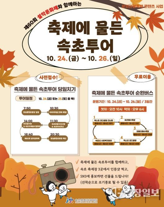 광장일보 이현나 기자 | (재)속초문화관광재단은 제60회 설악문화제를 맞아 수도권 시민들이 가을 정취 가득한 속초의 대표 축제들을 한 자리에서 체험할 수 있도록 특별 기획된 문화관광 콘텐츠 ‘축제에 물든 속초투어’를 운영한다.