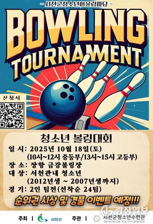 광장일보 주재영 기자 | 서천군 청소년을 위한 서천군청소년어울림마당 ‘청소년 볼링대회’가 오는 10월 18일 개최된다.