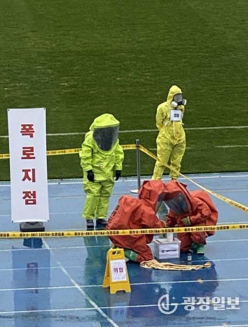 광장일보 나학천 기자 | 수원시 장안구보건소는 24일 수원종합운동장에서 수원장안경찰서, 수원소방서 등 유관기관과 함께 ‘2025년 생물테러 대응 대규모 합동훈련’을 했다.